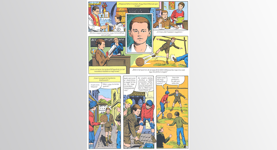 Aztán jött a bejelentés, a népességet leforrázó híradás 2005. április 2-án: II. János Pál pápa este 21 óra 37 perckor megtért az Úrhoz. A római Szent Péter téren egybegyűlt, ott virrasztó százezres tömeg elcsendesedett, s „vele együtt a Föld, mert a világ plébánosa éppen Krisztussal találkozott”. Majd néhány perc elteltével megszólaltak a harangok, felszakadt a bánat, kezdetét vette a gyász – az imádság a szeretet és a béke pápájának lelki üdvéért, aki igen hosszú utat járt be lengyelországi, wadowicei gyermekkorától a neki megadatott nyolcvannégy esztendőn át, aminek egy töredékét dolgozza fel a szemközti oldalon olvasható képregényünk.